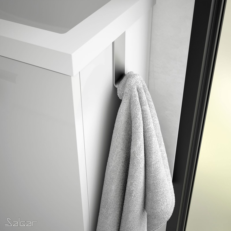 La percha Minimal ofrece un diseño innovador que te permite colgar tu toalla de manera conveniente en el lateral del mueble de baño, manteniéndola siempre al alcance.