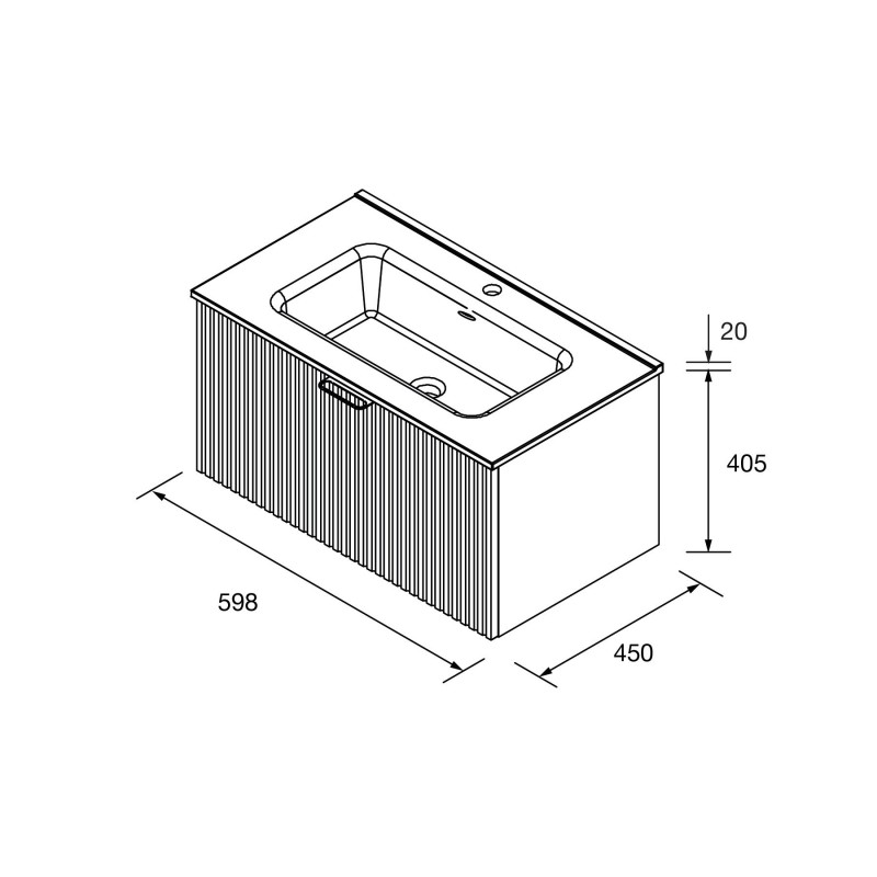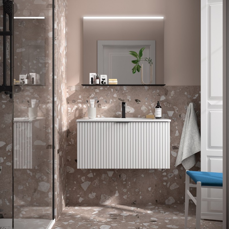 Ampliar El conjunto BIBA 60 (Mueble + Lavabo + Tirador) con frentes 3D y ranuras verticales ofrece diseño, almacenamiento y bienestar.