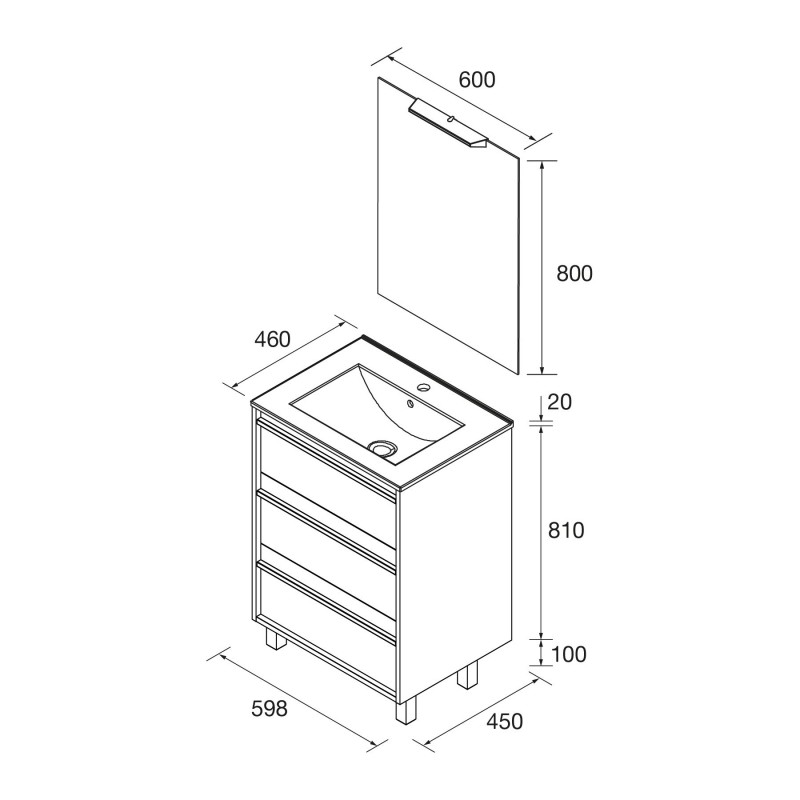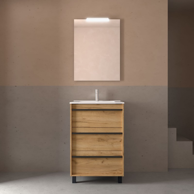 Compuesto de mueble Attila de 3 cajones, lavabo de porcelana, espejo y aplique LED. Incluido.