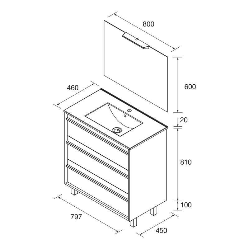 Compuesto de mueble Attila de 3 cajones, lavabo de porcelana, espejo y aplique LED. Incluido.