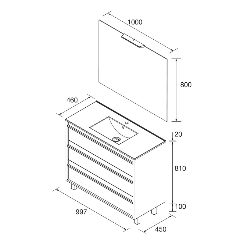 Compuesto de mueble Attila de 3 cajones, lavabo de porcelana, espejo y aplique LED. Incluido.