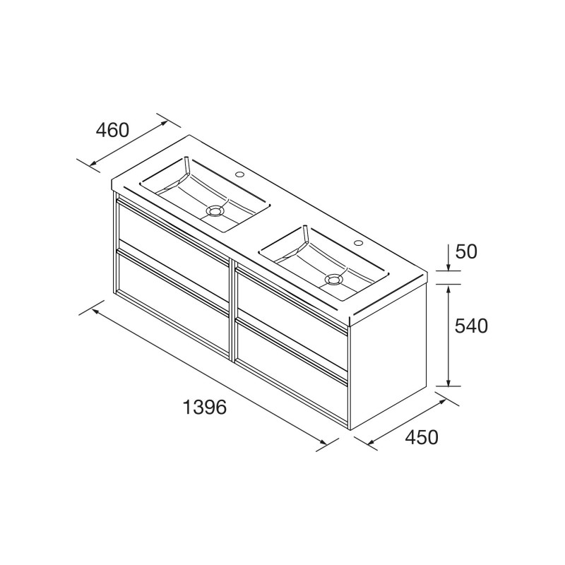 El mueble de baño suspendido ATTILA, con 1400 mm de ancho y 45 mm de fondo, cuenta con cuatro cajones que proporcionan un amplio espacio de almacenamiento.