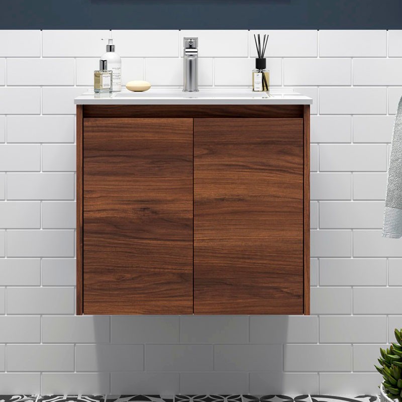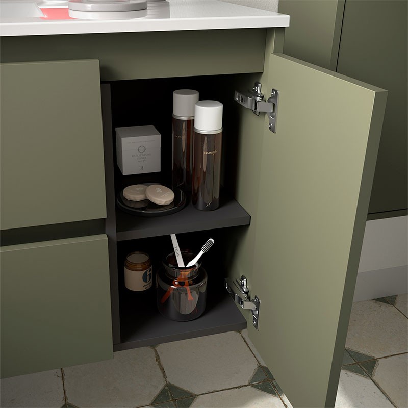 El lavabo integrado de porcelana completa el conjunto con estilo y durabilidad. Además, puedes ampliar tu espacio de almacenamiento combinando el mueble de baño con pilares a juego de la misma serie.