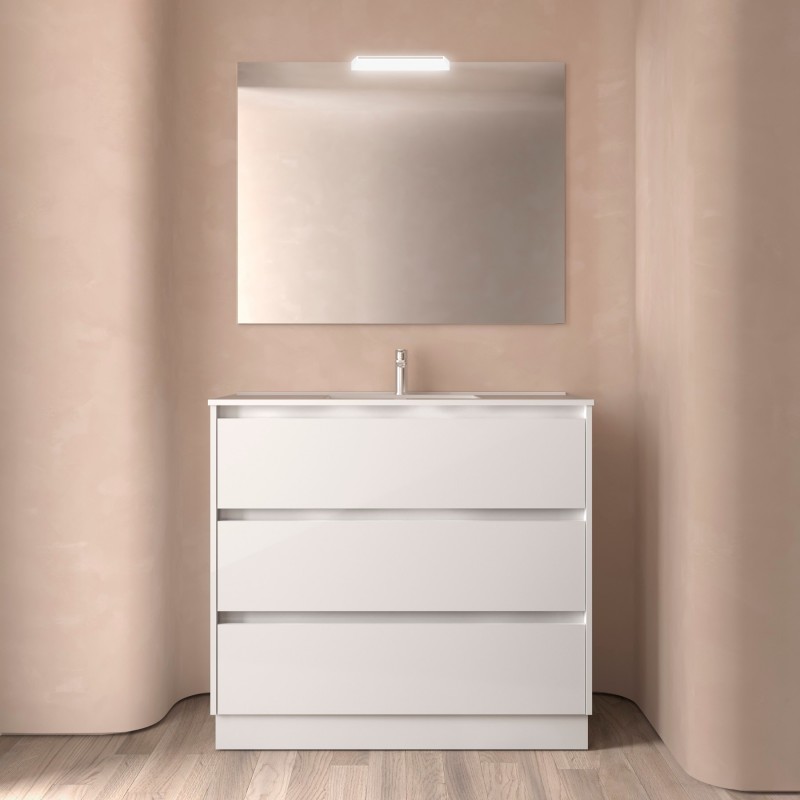Compuesto de mueble Noja de 3 cajones, lavabo de porcelana, espejo y aplique LED. Incluido juego de 4 patas