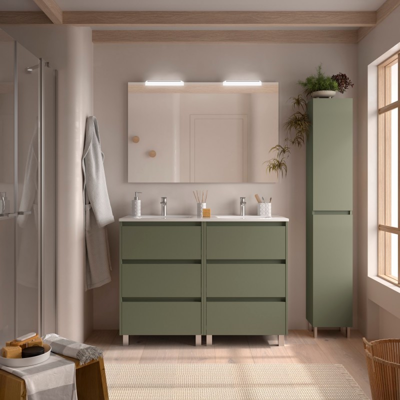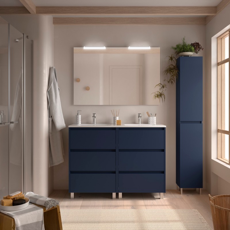 Compuesto de 2 mueble Noja de 6 cajones, lavabo de porcelana, espejo y 2 aplique LED. Incluidos 2 juegos de 4 patas anodizado brillo de 100mm.