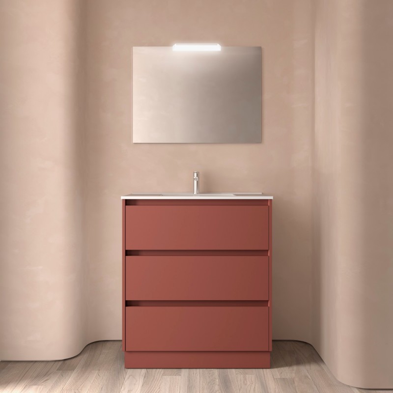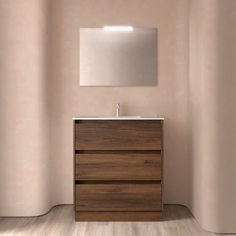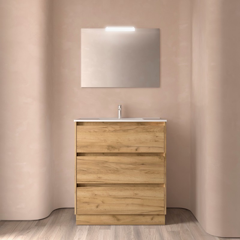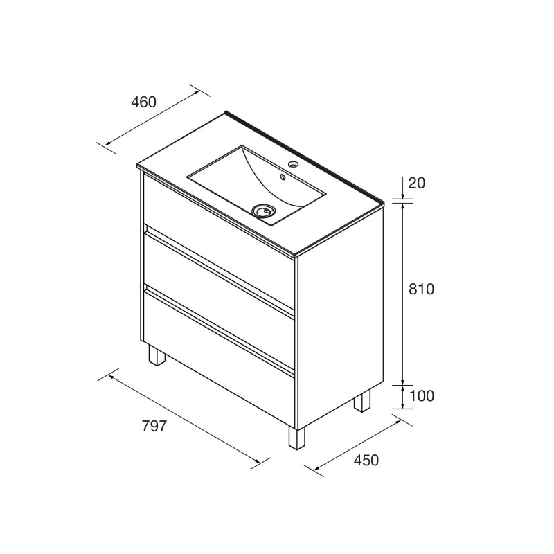 Compuesto de mueble Noja de 3 cajones y lavabo de porcelana. Incluido juego de 4 patas anodizado brillo de 100mm.